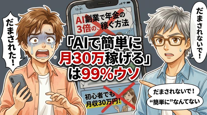 - 「AIで簡単に稼げる」系の話には絶対に乗らない